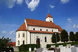 Die neuromanische Basilika wurde 1895/96 erbaut. Ihr Langhaus besteht aus einem Mittelschiff mit einem eingezogenen, halbrund geschlossenen Chor im Osten und einer halbrunden Apsis im Westen. Die beiden Seitenschiffe sind im Osten mit Apsiden abgeschlossen. An der Nordwand des Chors steht ein Chorflankenturm auf quadratischem Grundriss, der mit einem Pyramidendach bedeckt ist. Der Außenraum ist durch Lisenen und Bogenfriese gegliedert.