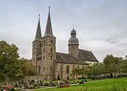 Im Dreißigjährigen Krieg legten von 1641 bis 1646 hessische und schwedische Truppen Kloster und Kirche in Schutt und Asche. Abt Ambrosius Langen ließ ab 1661 die Kirche wieder aufbauen. Der Baumeister Ludwig Baer aus Lügde erstellte die Pläne und ließ aus der ehemals romanischen Basilika eine Hallenkirche bauen. Ein neuer Chor wurde ebenfalls gebaut.[3]