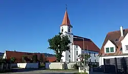 Die Saalkirche wurde bis 1662 nach der 1648 erfolgten Zerstörung des spätgotischen Vorgängerbaus unter Einbeziehung der Kapelle an der Südseite des Langhauses, die heute als Vestibül dient, errichtet. Das Langhaus hat im Osten einen eingezogenen Chor, vor dessen Ostseite der quadratische Choranschlussturm steht, der beim Wiederaufbau 1767–73 nach der Zerstörung durch einen Orkan um ein achteckiges Geschoss aufgestockt wurde, das die Turmuhr und den Glockenstuhl beherbergt. Darauf sitzt ein achtseitiger, spitzer Helm. Außerdem wurde in dieser Zeit das Langhaus verlängert und ihm ein Anbau vorgesetzt.