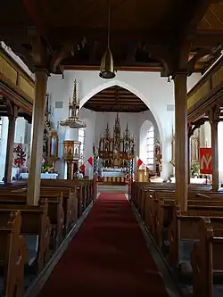 Der Kirchenpatron St. Jakobus ist oben im Hochaltar dargestellt. Links und rechts darunter befinden sich die heilige Barbara und Katharina. Zwei Bilder am Fuß des Hochaltars zeigen den Stammvater Abraham und den Hohenpriester und König von Salem, Melchisedech. Die beiden Seitenaltäre sind der Gottesmutter und dem heiligen Wendelin geweiht.