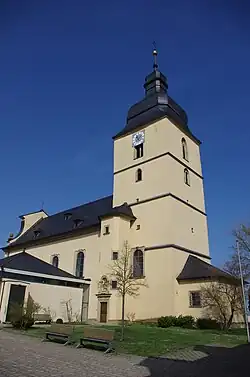 Der Chorturm wurde im Kern um 1600 erbaut. An ihn wurde nach Westen von 1717 bis 1723 nach einem Entwurf von Joseph Greising das mit einem Satteldach bedeckte Langhaus angebaut. Der Chorturm ist durch Gesimse in vier Geschosse gegliedert und mit einer schiefergedeckten Welschen Haube bedeckt. Die Decke des Chors, d. h. im Erdgeschoss des Chorturms, ist mit Stuck verziert. Die mit einem Schweifgiebel bedeckte Fassade im Westen ist durch Pilaster in drei Bereiche gegliedert, im mittleren befindet sich das Portal. Im südlichen Winkel von Chorturm und Langhaus steht ein Treppenturm.
