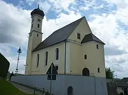 Die Saalkirche besteht aus einem Langhaus, das 1752 nach einem Entwurf von Johann Georg Hitzelberger erbaut wurde, einem eingezogenen, dreiseitig geschlossenen, spätgotischen Chor im Osten und einem Chorflankenturm auf quadratischem Grundriss an der Nordwand des Chors, dessen untere Geschosse aus der Spätgotik stammen. Er wurde 1758 mit einem Geschoss mit abgeschrägten Ecken aufgestockt, das die Turmuhr und den Glockenstuhl beherbergt, und mit einer Zwiebelhaube bedeckt.