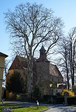 Die Kirche ist ein Nachfolgebau eines Sakralbaus, der bereits im 9./10. Jahrhundert existierte. An dem Quaderbau wirken noch Formen des 13. Jahrhunderts nach und an der nördlichen Obergadenwand haben sich Reste der romanischen Vorhalle erhalten. Im 14. Jahrhundert wurde sie zu einer Basilika umgebaut, deren Langhaus aus einem Mittelschiff und zwei Seitenschiffen besteht, die durch Arkaden getrennt sind. Im Osten des Mittelschiffs steht der eingezogene, von Strebepfeilern gestützte Chor mit Fünfachtelschluss, an dessen Nordwand ein Chorflankenturm steht, dessen Helm den Glockenstuhl beherbergt.