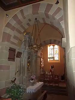 Der neoromanische Hochaltar trägt Darstellungen der vier Evangelisten, Jakobus der Ältere und des heiligen Antonius Abbas. Die beiden Seitenaltäre sind neoromanisch, die Fenster stammen aus den 1950er Jahren. Der alte barocke Hochaltar steht im ehemaligen Chor im Glockenturm.[2]