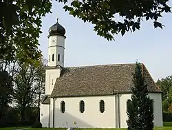 Die barocke Saalkirche wurde 1714/15 unter Verwendung von Teilen des abgerissenen Vorgängerbaus errichtet. Sie besteht aus dem Langhaus zu drei Jochen, dem dreiseitig geschlossenen Chor im Osten und dem beidseitig von Vorbauten flankierten Kirchturm im Westen. Von den zwei achteckigen Obergeschossen des mit einer Zwiebelhaube bedeckten Turms enthält das untere den Glockenstuhl und das obere die Turmuhr.