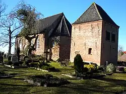 Der Turm steht frei und hat seinen Platz nur wenige Meter südöstlich der Kirchenapsis. Deutlich sichtbar ist eine Neigung des Baus nach Osten, die durch eine Absackung verursacht wurde. Sein Mauerwerk besteht ebenfalls aus Backstein; anders als das Kirchengebäude trägt der Turm ein Walmdach, das aber ebenfalls mit dunkelgrauen Ziegeln gedeckt ist.[1] Der abgegangene Vorgängerbau des Turms stand nördlich der Kirche.