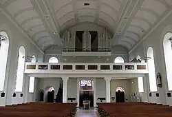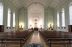 Während des Zweiten Weltkrieges wurde die Kirche so stark beschädigt, dass der Gottesdienst bis zum 5. September 1948 in einer Notkirche gehalten wurde. Die neogotische Ausstattung des ausgehenden 19. Jahrhunderts wurde zerstört. Unter großen Anstrengungen wurde die frühere Form durch den Architekten Heinrich Latz[12] aus Saarbrücken in den Jahren 1947/1948 unter der Ägide von Pfarrer Mathias Weiland wiederhergestellt. Die Pfarrangehörigen leisteten beim Wiederaufbau freiwillige Arbeitsdienste und spendeten Geld. Dabei wurde die ursprüngliche Flachdecke mit großen, überleitenden Hohlkehlen nicht wieder eingebaut. Der Raum wird nun von einem flachbogigen, kassettierten Tonnengewölbe abgeschlossen, das von Halbtonnen begleitet wird und dem Raum eine kühl-erhabene Wirkung verleiht. Am 5. September 1948 fand die Einsegnung der Kirche statt. Im Jahr 1959 wurde der baufällig gewordene Glockenstuhl erneuert.[13] Hohe Rundbogenfenster mit moderner Verglasung erhellen den Raum.