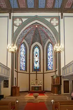 Der axial in der Apsis aufgestellte Blockaltar ist um zwei Stufen erhöht. Die polygonale, hölzerne Kanzel ruht auf einem achteckigen Fuß. Ursprünglich über dem Altar, ist sie sich rechts vom Taufstein aufgestellt. Der pokalförmige, achteckige Taufstein ist der älteste Gegenstand der Kirche. Er steht in der Mitte der Kirche axial vor der Bogen. Das Mittelfenster im Osten in der Apsis stellt den segnenden Christus dar. Dieses Fenster befand sich früher im Bremer Dom und soll vor 1850 geschaffen worden sein, in Nachahmung des Segnenden Christus von Bertel Thorvaldsen.