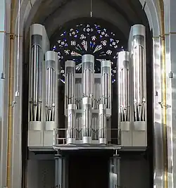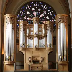 Die Hauptorgel von St. Johann befindet sich auf der Orgelempore im Westwerk, unterhalb der großen Fensterrosette.