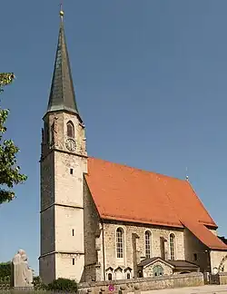 Die spätgotische Saalkirche aus Tuffstein wurde vermutlich unter Verwendung älterer Teile erbaut und 1477 geweiht. Das Langhaus wurde 1484 vollendet. Die Strebepfeiler sind dreifach abgesetzt und die Absetzung am Turmaufsatz feingliedrig wiederholt. Der Westturm erhielt 1727 einen Spitzhelm. Das Kircheninnere wurde 1763 von Franz Alois Mayr aus Trostberg barock gestaltet. Das Langhaus und der Chor haben ein Stichkappentonnengewölbe über Wandpfeilern mit vorgestellten Pilastern. Die Doppelempore im Westen ist ausladend geschweift. Zwei große, die Gewölbe füllende Fresken des Malers Johann Martin Heigl im Chor (Enthauptung des Johannes) und im Langhaus (Taufe am Jordan), sind mit einer bemalten Stuckatur umrandet.