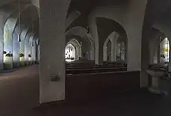 Kriegergedächtniskapelle (Vorkriegszustand), das ist die heutige Auferstehungskapelle: Neu-Ulm Katholische Stadtpfarrkirche Kriegergedächtniskapelle ugl. – Und später mit Kreuz und verändertem Fußbodenbelag: Neu-Ulm Katholische Stadtpfarrkirche Gedächtniskapelle für die gefallenen Krieger Apside mit Kreuz ugl. –