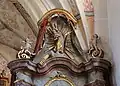 An der Südwand ist die barocke Kanzel angebracht. Auf dem Kanzelkorb sind die Figuren der vier Evangelisten (v.l.n.r) Markus, Matthäus, Lukas und Johannes. Diese haben eine Lüsterfassung. Auf dem Schalldeckel steht Christus als Salvator mundi.