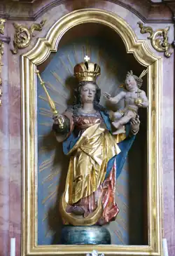 In der Altkirche ist im Chorscheitel eine Schmerzhafte Muttergottes aus dem Anfang des 18. Jahrhunderts. Im gotischen Langhaus über den Arkaden zum Erweiterungsbau ist eine Rosenkranzmadonna aus dem 17. Jahrhundert mit seitlichen spätbarocken Figuren der beiden hll. Johannes aus Albaching.