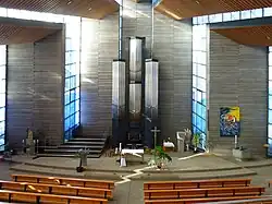 Der Kirchenbau gliedert sich in fünf schiffartige Rahmen. Das Kircheninnere hat den Grundriss eines Kreisausschnitts, in dessen Spitze der Altar steht. Die Verbindungen der fünffach gegliederten Bauteile sind mit Kunstglas gestaltet. Die Glasfenster, Lichtbänder in den Farben Blau und Grau, wurden von Ludwig Schaffrath gestaltet.