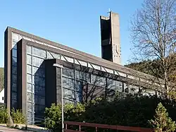 Der Entwurf des Neubaus stammt von Josef Laule, Architekt am Erzbischöflichen Bauamt Freiburg. Dominierende Baumaterialien der Kirche sind neben Sichtbeton, Glas und Holz vor allem die Schieferverkleidung im Außenbau. Das freitragende Kirchendach innen mit Holz verschalte Dach ist eine Stahlkonstruktion. Der Campanile aus Stahlbeton ist in seinem Material, Sichtbeton und Schiefer, auf den Kirchenbau abgestimmt. Zwei Seiten des Turms haben Uhrenzifferblätter. An der Innenseite des Turmschafts befindet sich eine Betonplastik, hinter der sich die Urkunde der Grundsteinlegung befindet.