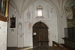 In den Jahren 1979/80 wurden am Eingangsportal spätgotische Fresken freigelegt. Dargestellt sind die Apostel Andreas und Jakobus der Ältere, der heilige Wolfgang und vermutlich Paulus.