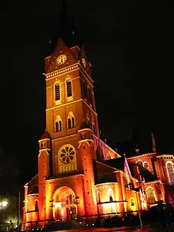 Die St.-Johannes-Kirche ist eine dreischiffige Basilika in neuromanischem Stil. Sie besitzt ein Kreuzschiff, einen West- und zwei Osttürme. Die Länge der Kirche beträgt 67 Meter, einschließlich Mauer und Treppe 75 Meter, die Breite 44 Meter und die lichte Höhe des Mittelschiffes 20,5 Meter. Die beiden Osttürme messen je 41 Meter, der Westturm (mit Kreuz und Hahn) 83 Meter.