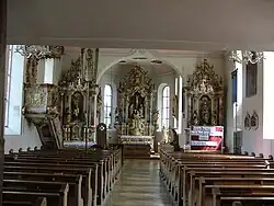 In der Kirche findet sich überwiegend Kunstwerke im Rokokostil. Um das Hauptbild im Langhaus (Deckenfresko: Predigt Johannes des Täufers) sind die vier Kirchenväter gruppiert. Das Deckengemälde im Chorraum zeigt die Himmelfahrt Marias und wird von den vier Evangelisten eingerahmt.[1]