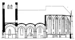 Der kreuzförmige Grundriss folgt noch dem romanischen Schema einer Basilika. Einem dreischiffigen Langhaus ist eine quadratische Turmhalle im Westen vorgelagert. Die Seitenschiffe sind in den ersten beiden Jochen nur halb so breit wie das Hauptschiff. Im dritten Joch weitet es sich querschiffartig mit drei quadratischen Jochen aus. Offenbar hat es jedoch dann während der Bauphase eine Planänderung hin zur Hallenkirche gegeben, denn die Seitenschiffe bekamen fast die gleiche Höhe wie das Mittelschiff und die Pfeiler wurden als Bündelpfeiler – etwas schlichter im Westen und mehrteiliger im Osten – ausgebildet. Die Quer- und Längsgurte sind spitzbogig geschlossen, Gewölberippen fehlen. Während die Architekturelemente aus rötlichem Wesersandstein gearbeitet sind, sind die Flächen innen verputzt und außen in Kalkbruchstein gearbeitet. Wahrscheinlich hatte die Kirche ursprünglich einen östlichen Abschluss durch einen rechteckigen Chor in der Höhe des Mittelschiffes.