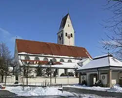 Die Basilika wurde 1474 erbaut. Das Langhaus besteht aus einem Mittelschiff und zwei Seitenschiffen, die im Innenraum mit Arkaden unterteilt sind. Der Chor im Osten des Mittelschiffs und der Chorflankenturm an dessen Nordwand wurden vor 1758 errichtet.