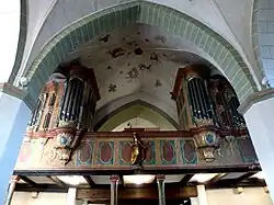 Das romanische Kirchengewölbe wird von vier mächtigen, achteckigen Pfeilern gestützt. 1934 wurden bei einer Kirchenrenovierung alte Wandmalereien aus dem 13./14. Jahrhundert entdeckt. So ist seitdem über dem Hochaltar wieder eine Darstellung Jesu Christi als Weltenrichter aus der Kölner Malschule zu sehen. Umgeben ist er von den Symbolen der vier Evangelisten. Zu seinen Seiten sind Maria und Johannes der Täufer sowie die vier Apostel Petrus, Paulus, Johannes Evangelist und Philippus dargestellt. Im westlichen Gebäudeteil finden sich an der Decke Malereien von Drachen, Greifvögeln und Fabeltieren. Sie sollen die bösen Geister symbolisieren, die vor Christus, dem Licht, in die Dunkelheit fliehen müssen. Der Boden besteht aus Schieferplatten.
