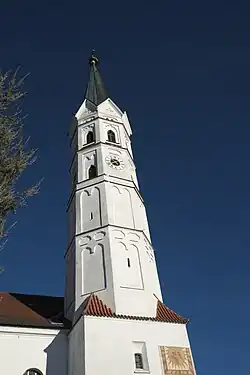 - Der Hochaltar mit seinen mächtigen Weinlaubsäulen wurde 1664 geschaffen. Die seitlichen Figuren aus der Zeit um 1740 stellen den heiligen Joseph (links) und Johannes Nepomuk (rechts) dar. Das Altarblatt wird sechs Mal im Jahr gewechselt. Es werden dem Kirchenjahr entsprechende Szenen präsentiert wie die Anbetung der Heiligen Drei Könige, ein Gemälde, das um 1630 datiert wird. Ein anderes Altarblatt ist mit Ignaz Fray 1808 bezeichnet und stellt in Anlehnung an das ursprüngliche, von Peter Paul Rubens gemalte Hauptaltarbild im Freisinger Dom Das apokalyptische Weib dar.