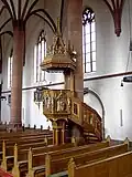 Die Kanzel umlaufen Reliefs mit den Mysterien Jesu: Ostern, Himmelfahrt, Pfingsten und die Schlüsselübergabe an Petrus. Fünf kleine, zwischen den einzelnen Darstellungen platzierte Figuren, sind Johannes der Täufer und die vier Evangelisten.