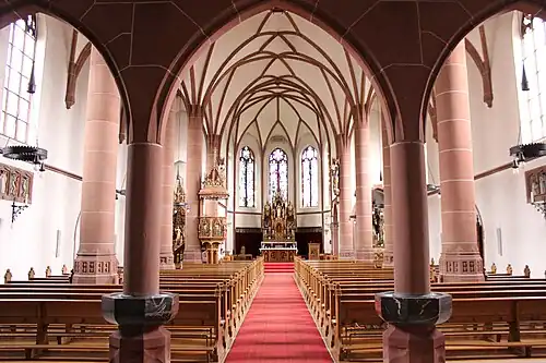 Die Kirche wurde in den Jahren 1909 bis 1911 nach Plänen von Wilhelm Schulte I. (Senior, Neustadt/Weinstraße) im Stil der Spätgotik errichtet. Schultes Bruchsteinbau ist klar in drei Teile gegliedert: Turm, Langhaus und Chor. Die nach Westen ausgerichtete Fassade wird von einem mächtigen Mittelturm mit sechs Geschossen und einem kleineren, achteckigen Treppentürmchen mit Maßwerkgalerie und Zwiebelhauben dominiert. Auf der Höhe des sechsten Geschosses des Mittelturmes befindet sich ein Umgang, mit durchbrochener Maßwerkbalustrade. Das Langhaus wird durch fünf Fensterachsen gegliedert und von einem Satteldach mit Dachreiter gedeckt. In Traufhöhe zieht sich ein Sims um das komplette Gebäude, was an der Westfassade zur optischen Gliederung dient. Der, leicht vom Kirchenschiff abgesetzte, Chor ist als 7/10-Abschluss ausgeführt. Südlich zwischen Schiff und Chor befindet sich ein kleiner Kapellenanbau, nördlich die Sakristei.