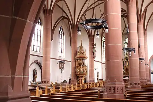 Der ehedem im benachbarten Kerzenheim in der Peterskapelle aufgestellte spätgotische Taufstein kam 1826 in den Vorgängerbau der heutigen Kirche, die Heilig-Kreuz-Kirche. Diese wurde wegen Baufälligkeit aufgegeben und nach 1911 abgetragen. Der Taufstein wurde in den Neubau übernommen.