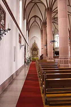 Durch das Hauptportal gelangt man in das Turmuntergeschoß, welches als Eingangsraum fungiert. Das Innere zeigt sich als dreischiffige Hallenkirche mit leicht erhöhtem Chor. Die Orgelempore im Westen ist in der Form eines gotischen Lettners ausgeführt. Die Decke ist mit einem Sterngewölbe überzogen.[2]