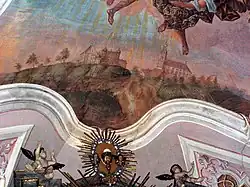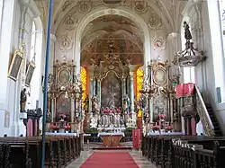 Das Turmerdgeschoss kann durch eine einfache, mit Kupferblech beschlagene Tür betreten werden und bildet einen Vorraum. Ein schweres, mit Eisennägeln beschlagenes Portal aus Eichenholz führt ins Innere. Zunächst befindet sich der Besucher unterhalb der Doppelempore, welche im rückwärtigen Langhausjoch eingezogen ist. Tritt man etwas weiter nach vorne, so eröffnet sich ein hoher, lichter Raum, der von einem Tonnengewölbe mit Stichkappen überspannt ist. Die gleiche Gewölbeform ist auch im Chorraum anzutreffen. Das mit zahlreichen Fresken und Grisaillen verzierte Gewölbe ruht auf Pilastern mit Stuckverzierungen und stark profiliertem Gebälk. Der Altarraum ist mittels eines runden Chorbogens merklich eingezogen. Die Beleuchtung des Raumes erfolgt über hohe Rundbogenfenster. Die beiden schräg neben dem Hochaltar angeordneten Fenster besitzen gelbes Glas, welches den Chorraum in ein besonderes Licht taucht.[3]
