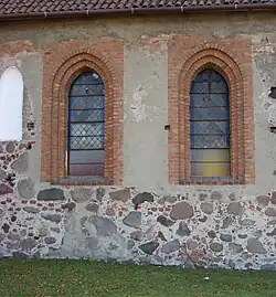 Der Kirchturm ist etwa hundert Jahre später vorgesetzt worden – mit Feldsteinen im Unterbau.[2] Die oberen drei Stockwerke sind gemauert und an zwei oberen Seiten mit Staffelgiebeln verziert. Aus dem Jahre 1772 stammen die Zifferblätter für die Uhr auf den vier Seiten des Turms. Sie wurden von der Patronatsfamilie von der Groeben gestiftet.