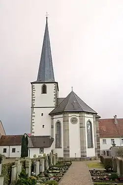 Die Saalkirche mit einem eingezogene Chor im Norden des Langhauses und dem an der östlichen Seite des Chors stehenden Chorflankenturm wurde am Jakobsweg 1766 nach Plänen von Johann Michael Fischer, dem Nachfolger von Balthasar Neumann, erbaut. Aus vorheriger Zeit (1574) blieb nur der dreigeschossige 35 Meter hohe Julius-Echter-Turm stehen. Die zweigeschossige gegliederte Fassade hat oben einen Volutengiebel mit der Statue des Guten Hirten in einer Wandnische. Über dem Portal befindet sich ein Relief mit dem Wappen des Stifters, mit Kurfürstenhut und Schwert und Bischofsstab als Symbole weltlicher und geistlicher Gerichtsbarkeit. In den seitlichen Nischen der Fassade stehen die Statuen von Johannes dem Täufer und Johannes dem Evangelisten.