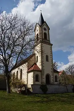 Die neuromanische Saalkirche wurde 1853 an Stelle eines älteren Vorgängerbaus errichtet. Der quadratische Chorturm, der von eingeschossigen Anbauten flankiert wird, steht im Osten des Langhauses. Sein oberstes Geschoss, dessen Ecken abgeschrägt sind, und mit Zwerchhäusern endet, beherbergt die Turmuhr und den Glockenstuhl, in dem vier Kirchenglocken[3] hängen. Darauf sitzt ein schiefergedeckter spitzer Helm.[4][5]