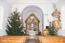 Im Schiff wird durch ein Tonnengewölbe mit tiefen Laibungen der Fenster überspannt. Im Westteil steht eine Doppelempore. Der Altarraum mit Kreuzgratgewölbe hebt die Bedeutung des Raumes an.