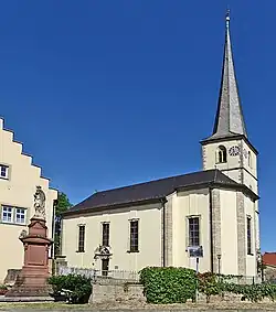 Die unteren Geschosse des an der Nordwand des Chors stehenden Chorflankenturms, die zum Chorturm des Vorgängerbaus gehörten, stammen aus der 2. Hälfte des 13. Jahrhunderts. Sein oberstes Geschoss, das die Turmuhr und den Glockenstuhl beherbergt, und den achtseitigen, schiefergedeckten Knickhelm, erhielt er 1607. Das 1590–1612 gebaute Langhaus der Saalkirche, das mit einem Satteldach bedeckt ist, wurde 1714/15 erweitert und barockisiert.