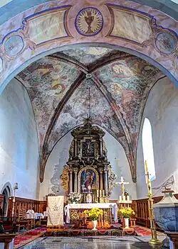 Der einjochige, quadratische und kreuzgewölbte Chor ist mit Strebepfeilern besetzt. Die Diagonalbogen sind Halbkreise, die Schildbogen Spitzbogen. Die beim Kirchenbrand von 1924 zerstörte Decke des Langhauses ruhte auf einem ausgeschnittenen Ständer aus Sattelholz von 1562. Das Ostfenster besitzt eine romanische Schräge. Das gotische Steinportal aus dem 14. Jahrhundert wird in den Ecken von Rundsäulen flankiert. Die Kapitäle sind mit Laubwerk verziert. Der Steintabernakel stammt aus dem Jahr 1300, der Renaissance-Altar im Chor aus dem 17. Jahrhundert.