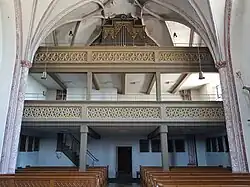 Die Sakristei aus der Bauzeit der Kirche wird durch ein mehrfach gekehltes Steinportal mit waagerechtem Sturz und ein Türblatt aus Eichenholz mit einem lilienförmig endendem Beschlag aus der ersten Hälfte des 16. Jahrhunderts erschlossen. Bei dem Stichkappengewölbe des quadratischen Raumes wurden die Gewölberippen vermutlich im frühen 18. Jahrhundert entfernt. An der Westseite des Raumes ist eine mehrteilige, im oberen Teil nach rückwärts einspringende Schrankwand aus dem frühen 18. Jahrhundert mit einer Imitationsmalerei von Intarsien eingebaut, die 1991 freigelegt und restauriert wurde.