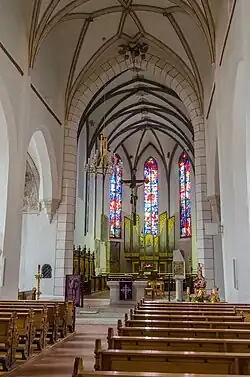 Der Innenraum besteht aus einem dreischiffigen Langhaus in der Form einer Pseudobasilika, und einem einschiffigen fünfseitig geschlossenen Chor, der die gleiche Breite wie das Mittelschiff aufweist. Das fensterlose Mittelschiff des Langhauses ist breiter und höher als die Seitenschiffe und wird von einem aufwändigen Netzrippengewölbe mit plastischen Schlusssteinen gedeckt. Die spitzbogigen Mittelschiffarkaden werden von achteckigen Pfeilern getragen. Die Seitenschiffe besitzen wie der Chor schlichte Kreuzrippengewölbe, die im Chor auf Wanddiensten über Kopfkonsolen aufliegen.