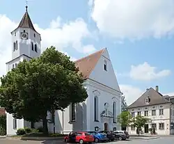Die barocke Saalkirche wurde 1702 anstelle des baufälligen Vorgängerbaus errichtet. Sie besteht aus dem Langhaus, dem eingezogenen, halbrund geschlossenen Chor im Süden und dem Kirchturm an der Ostwand des Langhauses, dessen quadratische unteren Geschosse von einem Chorturm aus dem 13./14. Jahrhundert stammen. Er wurde um ein achteckiges, mit einem spitzen Helm bedecktes Geschoss erhöht, das die Turmuhr und den Glockenstuhl mit vier Kirchenglocken enthält. Die Sakristei steht an der Ostwand des Chors. In ihrem Obergeschoss ist ein Oratorium untergebracht.
