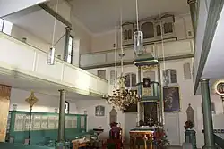Dem Markgrafenstil entsprechend liegen Altar, Kanzel und Orgel übereinander. Die Gemälde des Altarretabels wurden vom Schneyer Maler Georg Albrecht Meuser (1711–1784) geschaffen und zeigen links die Geburt, mittig die Kreuzigung (auf demselben Bild darunter das Abendmahl) und rechts die Auferstehung Jesu Christi. Die Gemälde – wie auch eine Glocke – sind eine Stiftung des Bäckermeisters Simon Premser.[5][8]