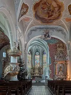 Der spätgotische Kirchenbau hat ein im Grundriss fast quadratisches Langhaus mit einer Länge von 22 Metern, einer Breite von 20 Metern und einer Höhe von 12,5 Metern. Es wird von einem Satteldach überspannt. Die dreischiffige Staffelhalle hat vier Joche, die von sechs Pfeilern getragen werden. Das Mittelschiff wird von barocken Korbbogengewölben überspannt. Den Innenraum prägt die im Verhältnis zum Hauptschiff stark nach Norden verschobene Achse des Chores. Mit einem stuckierten Vorhang rechts vom Chorbogen soll der Chorraum doppelt so groß wirken und die Asymmetrie kaschiert werden. Auf einem eingezogenen Lattengewölbe wurden die Stuckierung und Freskierung aufgebracht, im östlichen Joch der Seitenschiffe sind zwei Hängekuppeln eingefügt.[2]