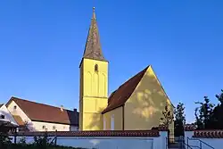„Spätgotischer Saalbau mit eingezogenem Polygonalchor und Flankenturm, Ende 15. Jahrhundert; mit Ausstattung Friedhofsmauer, mittelalterlich“