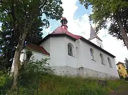Die heutige Kirche unter dem Patrozinium des hl. Johannes von Nepomuk[3] wurde auf Kosten des Religionsfonds erbaut.[4] Der Standort auf einer Anhöhe über dem Dorf wählte der Prager Weihbischof Krieger persönlich. Der Grundsteinlegung erfolgte 1787. Bis 1789 war der Bau fertiggestellt. Über das Patronatsrecht verfügte die Herrschaft. Der prismatische Turm kam erst 1810 hinzu. 1815 stiftete der Wohltäter Johann Lauber aus Hausnummer 90 einen gläsernen Lüster. 1905 erhielt die Kirche eine neue Orgel vom berühmten Prager Orgelbauer Heinrich Schiffner. Der letzte deutsche Pfarrer der Pfarrei war Josef Hüttl (* 1. März 1908 in Alt-Sattl).
