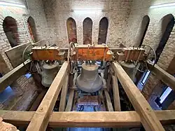Die sechs neuen Glocken wurden von der Glockengießerei Bachert in Heilbronn gegossen.[21] Neben dem Namen der Heiligen, denen die jeweilige Glocke gewidmet ist, sind die Glocken mit dem Text des Gloria Patri beschriftet. Der Text ist in zwei Zeilen auf die vier großen Glocken verteilt: „Ehre sei dem Vater / und dem Sohn / und dem heiligen Geist / wie es war im Anfang / jetzt und immerdar / und von Ewigkeit zu Ewigkeit / Amen Amen Amen“.