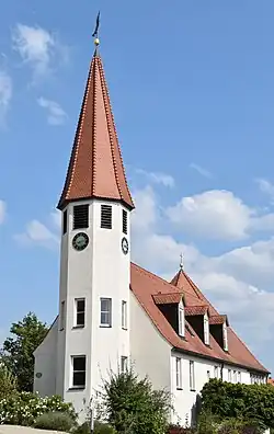 An den Apostel Johannes sollen die von Barbara Gsaenger entworfenen Altar- und Kirchenfenster erinnern, die das 1. Kapitel der Johannesoffenbarung darstellen. Der Posaunenengel auf der Kirchturmspitze ist eine Anspielung an Offb 14,6 : „Ich sah einen Engel fliegen mitten durch den Himmel, der hatte ein ewiges Evangelium zu verkündigen...“. Auf den vier Glocken sind „Ich-bin-Worte“ Jesu aus dem Johannesevangelium zu lesen.