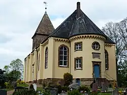 Der romanische Feldsteinturm mit seiner mittelalterlichen Verblendung aus Granitquadern wurde oberhalb der romanischen Schall-Biforien mit neuzeitlichem Backstein erneuert. Darüber erhebt sich ein Zeltdach. Das heutige Westportal aus Sandstein entstand beim Umbau der Kirche 1719 und hat Ähnlichkeit mit den beiden seitlichen Portalen des Kirchenschiffs. Über dem Türsturz aus Kalkstein hat es einen halbrunden Entlastungsbogen, der statt eines Tympanons ein schmuckloses Oberlicht umfasst. Die Gewände sind in einen angedeuteten Vorbau eingebettet, der statt mit einer Attika mit einem geschwungenen „Dach“ aus verputztem Mauerwerk schließt. Unregelmäßige Baufugen zeigen an, dass beim Einbau des Portals auch das umgebende Granitmauerwerk ausgetauscht wurde.