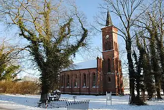 Der rechteckige Backsteinbau im neugotischen Stil mit polygonalem Chorschluss wurde ab 1844 an einem neuen Standort errichtet. Die Außenwände des Langhauses sind durch rechteckige Bleiglasfenster mit spitzbogigem Abschluss und gestuften Stützpfeilern mit bekrönendem Kreuz gegliedert. Das Dach ist mit Dachplatten aus Eternit eingedeckt. Auf der Westseite wurde ein quadratischer, sich nach oben verjüngender Turm mit abgewalmten Spitzhelm und mit glatten Giebelwänden vorgesetzt. Im Obergeschoss des Turms wurden die doppelt angeordneten Spitzbogenfenster als Schallluken für die Glocken ausgebildet.