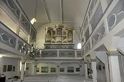 Die Orgel von Johann August Poppe aus dem Jahr 1830 ist die dritte Orgel in der Kirche, die Vorgängerin aus dem Jahr 1664 war völlig unbrauchbar geworden. Die zweimanualige Orgel wurde am 23. November 1830 feierlich eingeweiht. Der Orgelprospekt ist frühromantisch und in zwei äußere Rundtürme und einen größeren mittleren Rundturm gegliedert. Die äußeren enthalten die Prinzipal-8′-Pfeifen des Hauptwerks. Der mittlere enthält im oberen Teil die Prinzipal-4′-Pfeifen des Oberwerks und im unteren Teil 21 stumme Pfeifen. Die geschwungenen Gesimse der drei Türme sind mit getriebenem Blech verziert. Die Orgel hatte ursprünglich 19 Register.