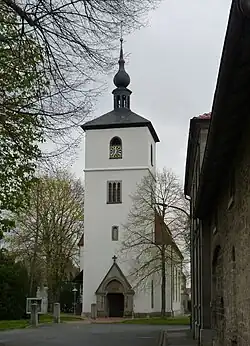 Die Kirche ist umgeben von einem von einer Mauer eingefriedeten ehemaligen Friedhof (Kirchhof), auf dem noch einige ältere Grabmale sowie ein monumentales Kriegerehrenmal[21] für Gefallene des Ersten Weltkriegs stehen. Seit 1866/1885[22] gibt es einen neuen Friedhof an der heutigen Bahnhofstraße.